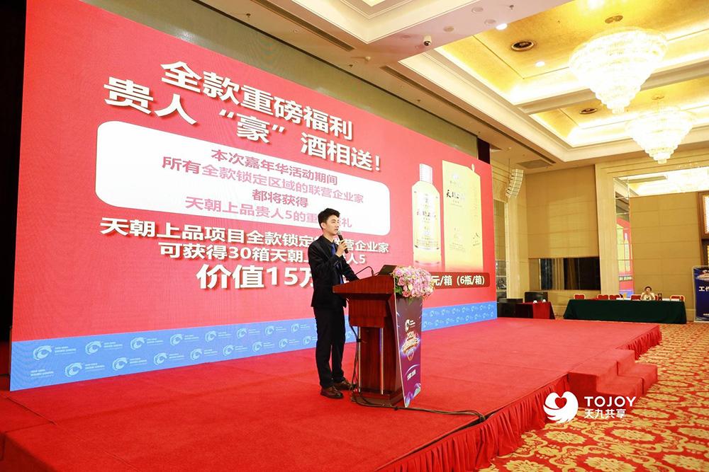 曾祥坤總助詳細介紹了天朝上品全國聯(lián)營項目。天朝上品是茅臺技開公司的核心戰(zhàn)略品牌,經(jīng)過多年的發(fā)展與耕耘,得到市場和消費者的廣泛認可,與天九共享集團合作以來,通過線上線下相結(jié)合方式,積極推進天朝上品全國聯(lián)營項目,助力企業(yè)家成功跨界,賦能企業(yè)快速成長和發(fā)展。今年雖然受突如其來的疫情影響,但是天朝上品品牌熱度不減反升,簽約加盟的客戶紛至沓來,新開業(yè)的專賣店銷售火爆,各地經(jīng)銷商自主舉辦品鑒會等線下活動,收益頗豐,天朝上品將繼續(xù)與天九共享集團大力推動全國聯(lián)營項目,聯(lián)合全國優(yōu)秀企業(yè)家踐行“給世界一瓶好酒”的承諾,共享柔和醬香資源,共同締造世界級品牌。