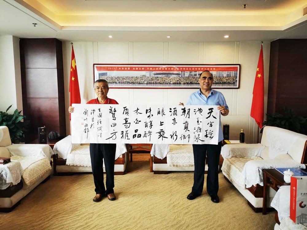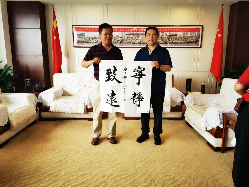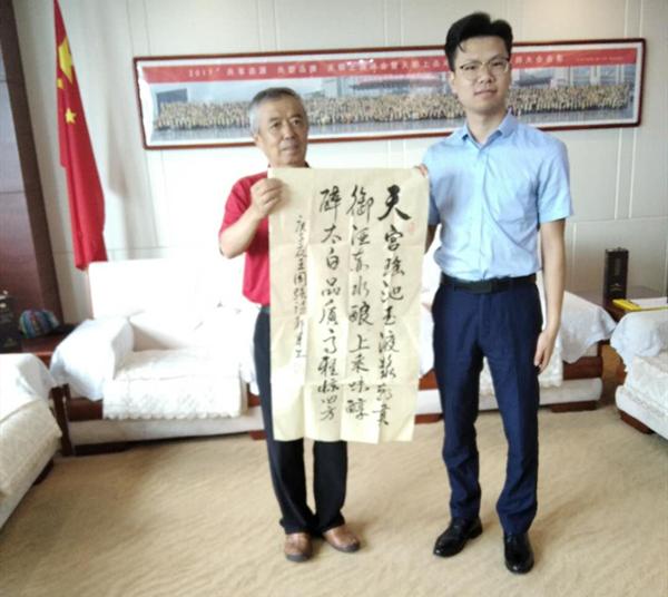王明增院長(zhǎng)現(xiàn)場(chǎng)賦藏頭詩(shī)一首:“天宮瑤池玉液漿,朝貢御酒赤水釀,上乘味醇醉太公,品質(zhì)高雅驚四方?!北磉_(dá)了對(duì)柔和醬香美酒的喜愛(ài)之情。楊吉壽先生將“寧?kù)o致遠(yuǎn)”、“玉液瓊漿”兩幅斗方贈(zèng)送給黃永毅總裁,祝愿天朝上品再創(chuàng)佳績(jī),續(xù)寫(xiě)輝煌。