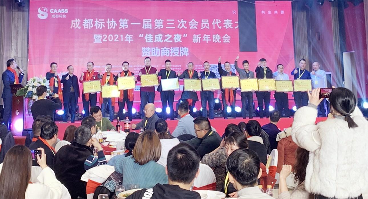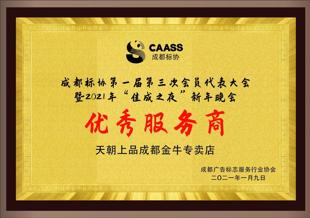 2021年1月9日,成都廣告標(biāo)識服務(wù)行業(yè)協(xié)會第一屆第三次會員代表大會暨2021年“佳成之夜”新年晚會在蓉舉行。本次活動由成都市金牛區(qū)天朝上品專賣店贊助,成都市機(jī)械行業(yè)協(xié)會、成都智能焊接裝備行業(yè)協(xié)會等230余家會員單位代表出席。在本次活動中,天朝上品成都金牛區(qū)專賣店喜獲成都標(biāo)協(xié)頒發(fā)的“優(yōu)秀服務(wù)商”榮譽(yù)。