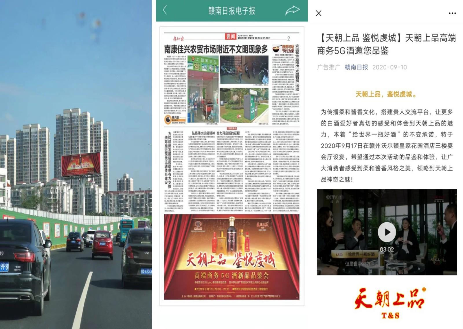 9月25日,由品上醬酒業(yè)獨家贊助的撫州商會2020年“迎中秋、慶國慶”聯(lián)誼晚會如約而至,天朝上品全國聯(lián)營項目隆重發(fā)布,吸引了眾多優(yōu)秀企業(yè)家加盟。為了讓“天朝上品 給世界一瓶好酒”家喻戶曉,江洲董事長還投入30萬元在贛南交通主干道上樹立了兩塊戶外大牌,《贛南日報》及官方公眾號也傾情為天朝上品品宣助力。