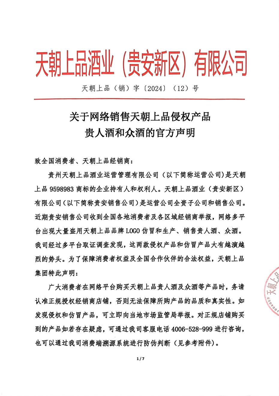 關(guān)于網(wǎng)絡(luò)銷(xiāo)售天朝上品侵權(quán)產(chǎn)品貴人酒和眾酒的官方聲明