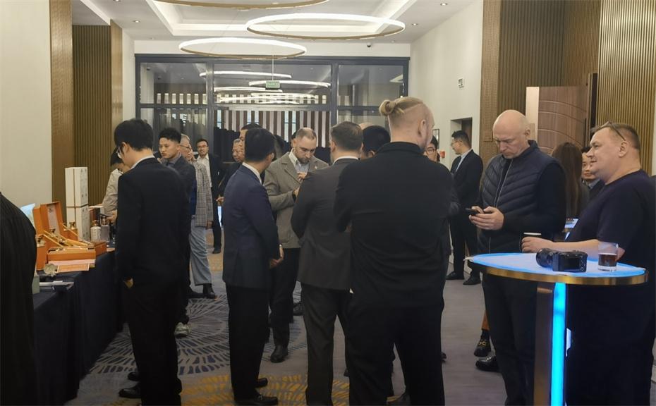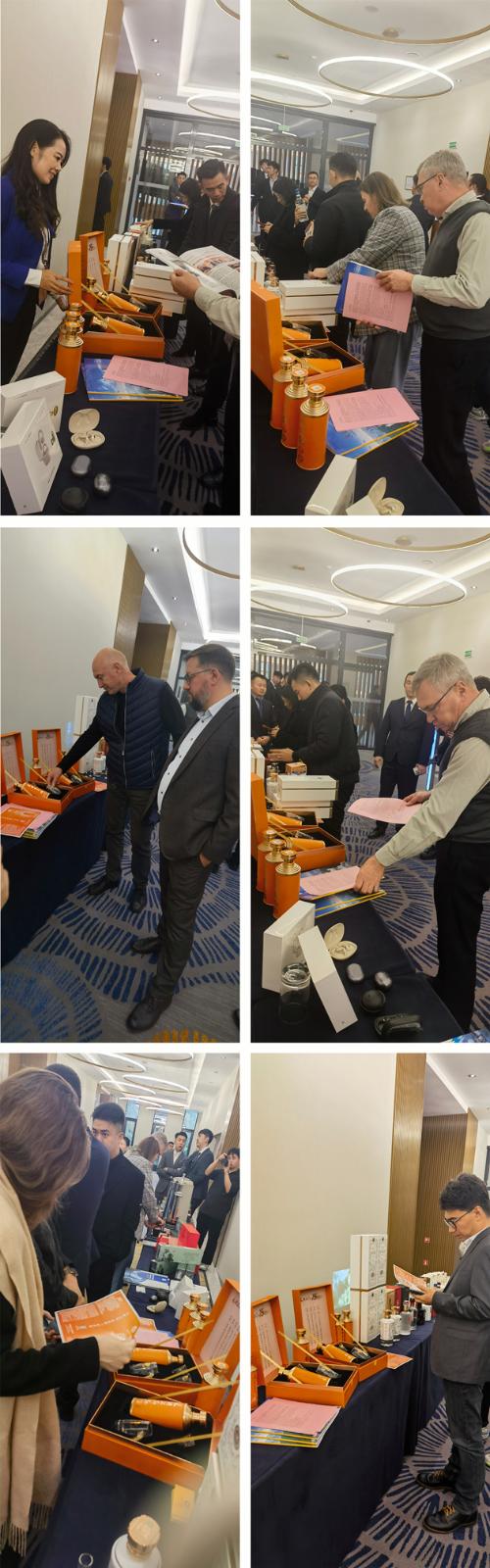 推介會現(xiàn)場,品質上乘,口感綿柔,包裝精美的天朝上品吸引了眾多海外賓客,天朝上品展示區(qū)品鑒、咨詢的賓客絡繹不絕,通過“觀、聞、嘗、得”四步品鑒法,品嘗綿柔醬香更綿更柔更醇香的口感,感受天朝上品品牌和文化的魅力,獲得大家一致好評。