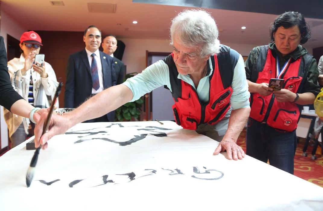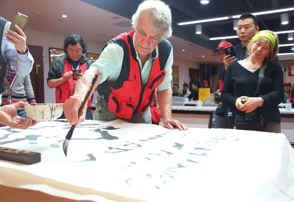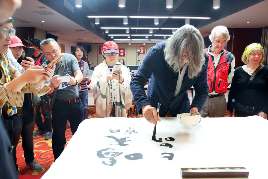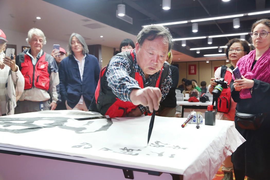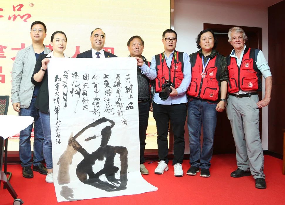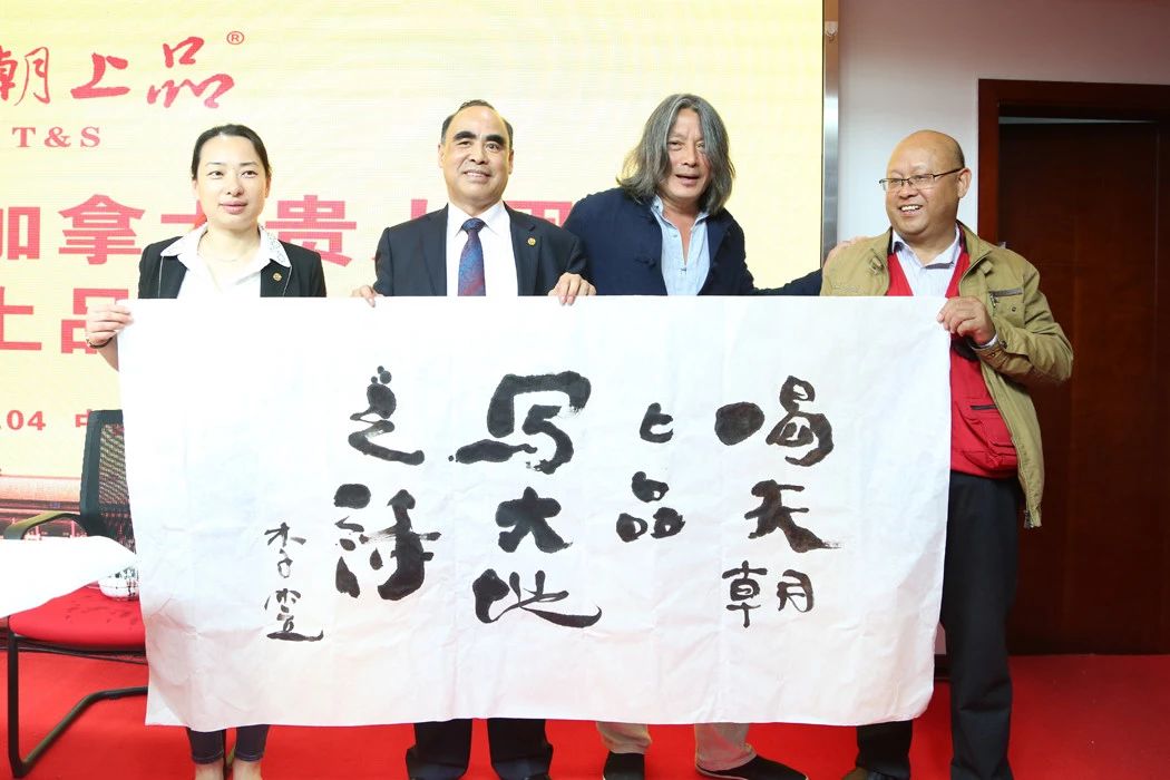 活動(dòng)現(xiàn)場(chǎng)氣氛活躍,嘉賓們興致勃勃的賦詩(shī)作畫(huà),贊譽(yù)天朝上品味之醇、香之濃、色之美。龍脈山水畫(huà)創(chuàng)始人丌春章先生現(xiàn)場(chǎng)賦詩(shī)一首:“英雄自古都飲酒,上品入膽壯志酬。今有中加攝影團(tuán),天朝飲過(guò)揚(yáng)九州?!比鸬湓?shī)人李笠題詞:“喝天朝上品,寫(xiě)大地之詩(shī)?!盤(pán)SA美國(guó)攝影學(xué)會(huì)主席Ted Nodwell也欣然用毛筆繪出楓葉,用英文題詞:“來(lái)自加拿大的問(wèn)候?!敝型饧钨e現(xiàn)場(chǎng)揮毫潑墨,表達(dá)了對(duì)柔和醬香美酒的喜愛(ài)之情,為天朝上品留下了精美的書(shū)畫(huà)作品。