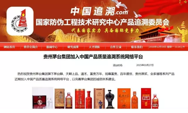 2015年11月6日,茅臺酒廠集團技術(shù)開發(fā)公司在全國白酒行業(yè)率先啟動產(chǎn)品質(zhì)量追溯系統(tǒng),實行“一物一證、一證一密、隨機生成、互相綁定、不可復(fù)制”,可以真實、準確、科學(xué)、系統(tǒng)地記錄生產(chǎn)、倉儲、物流、銷售全過程的信息,實現(xiàn)產(chǎn)品質(zhì)量保證和追溯,有效解決了目前市場上存在的嚴重假冒偽劣現(xiàn)象,在探索白酒企業(yè)全面建立質(zhì)量安全追溯體系方面走在了前列,做出了示范。