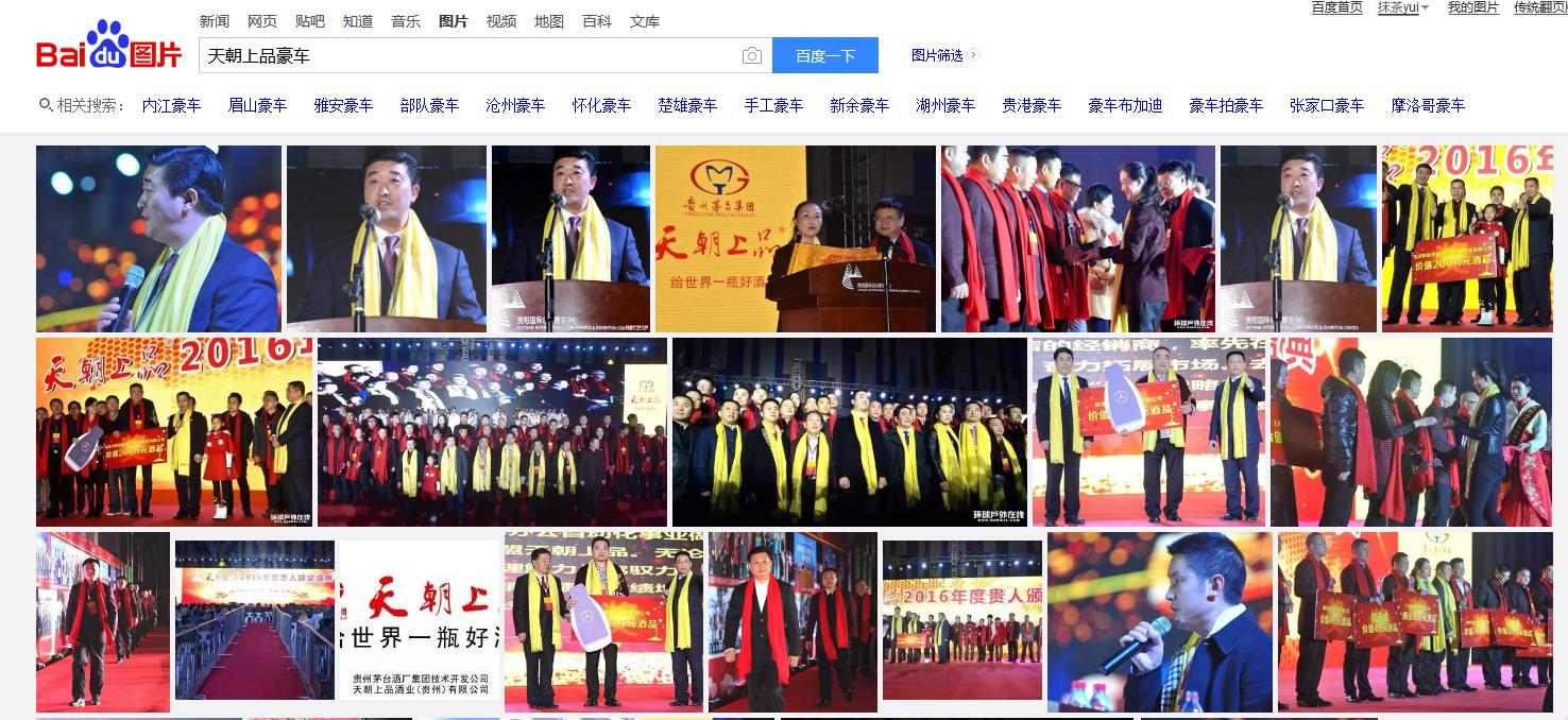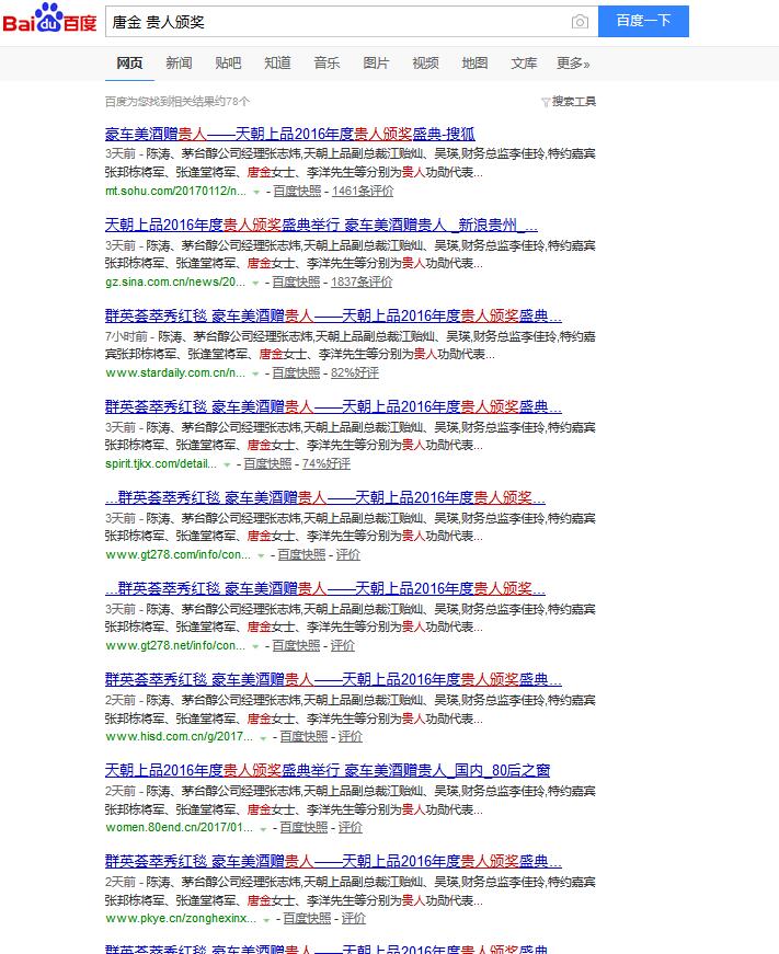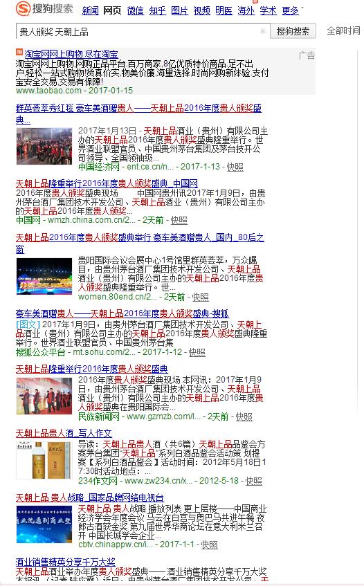 2017年1月9日,由貴州茅臺酒廠集團技術(shù)開發(fā)公司、天朝上品酒業(yè)(貴州)有限公司主辦的天朝上品2016年度貴人頒獎盛典隆重舉行。中國網(wǎng)、貴州電視臺、貴州廣播電視臺交通旅游頻道全程錄播;新浪網(wǎng)、熱點貴州全程直播;特邀中國旅游信息報,貴州日報資深記者直擊現(xiàn)場,記錄精彩瞬間;國內(nèi)眾多知名媒體紛紛予以報道,天朝上品貴人頒獎典禮繼貴人戰(zhàn)略全球啟動儀式之后,再次成為國內(nèi)輿論持續(xù)關(guān)注的熱點。