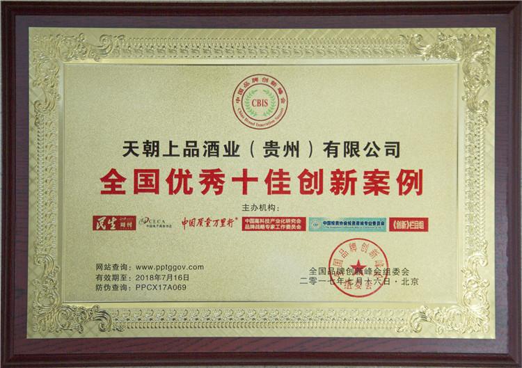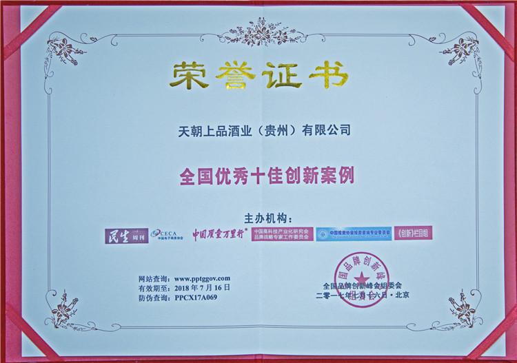2017年7月16日,由人民日?qǐng)?bào)社《民生周刊》雜志社、中國(guó)電子商務(wù)協(xié)會(huì)、《中國(guó)質(zhì)量萬里行》雜志社、中國(guó)高科技產(chǎn)業(yè)化研究會(huì)品牌戰(zhàn)略專家工作委員會(huì)、中國(guó)投資協(xié)會(huì)投資咨詢專業(yè)委員會(huì)、CCTV證券咨詢《創(chuàng)新》欄目等聯(lián)合主辦的“中國(guó)品牌創(chuàng)新峰會(huì)”暨“全國(guó)經(jīng)濟(jì)創(chuàng)新模式誠(chéng)信企業(yè)”推廣活動(dòng)在京舉行,天朝上品獲“中國(guó)行業(yè)品牌創(chuàng)新50強(qiáng)”、“全國(guó)優(yōu)秀十佳創(chuàng)新案例”。