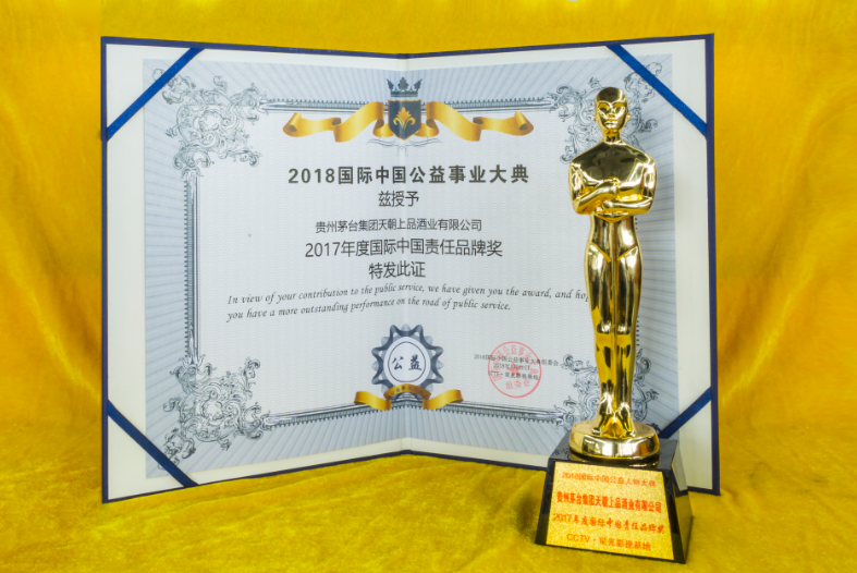 2018年1月20日,2018國際中國公益事業(yè)大典在北京中國中央電視臺·星光影視基地盛大啟動,天朝上品在本次盛典中榮獲“2017年度國際中國責任品牌獎”,文化部原副部長潘振宙為天朝上品頒獎。